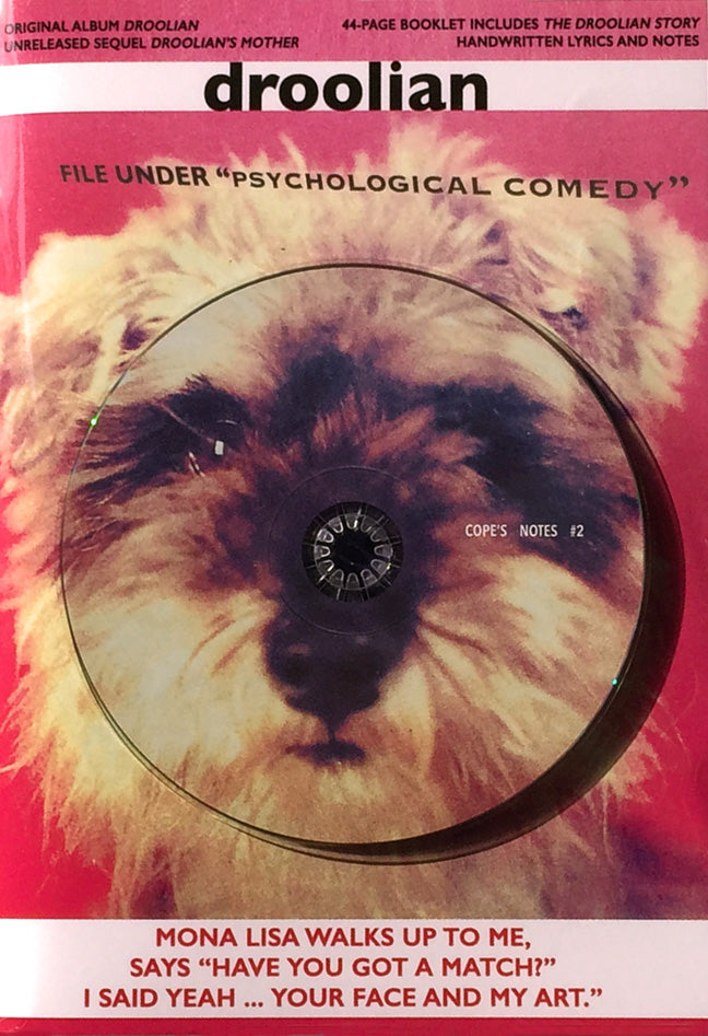 Rejoice rejoice, for it is time to celebrate a grand reissue from the crossroads of the Archdrude’s long careering show-business. Droolian. Unavailable for several years now, this bizarre 1990 homespun monsterpiece is here unleashed in a special edition, attended by a 44-page booklet and Cope’s long-threatened 22-minute sequel Droolian’s Mother.